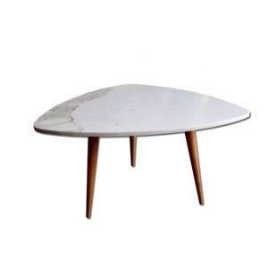 Couchtisch, Kaffeetisch mit einem Keramikblatt „Bianco Statuario”, Tischbeine aus Buchenholz.