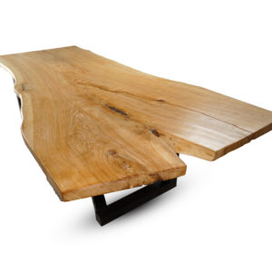Tisch aus massiven Eschenholz mit einem schwarzen Untergestell aus Stahl.
