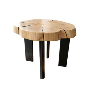 Couchtisch, Kaffeetisch aus Ulmenholz mit schwarzem Untergestell aus Stahl.
