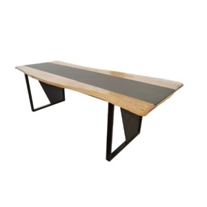 Tisch aus Birkenholz verbunden mit Keramik „Calce Nero“ und einem schwarzen Untergestell aus Stahl.